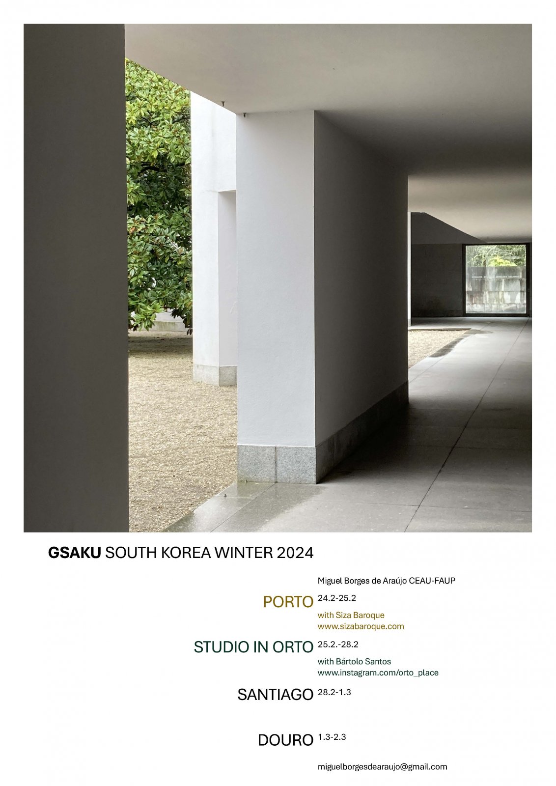O programa SOUTH KOREA WINTER 2024, organizado e acompanhado por Miguel Araújo, inaugura o roteiro Siza na ‘Sala Barroca’ (CEAU-FAUP). O programa prossegue em Serralves, Matosinhos, Viana do Castelo, Santiago de Compostela, Chaves, Vila Real, Amarante, e Marco de Canaveses.
